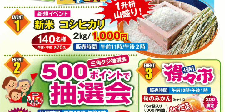 ポイントがたくさん貯まるイベントなどありますか?- 毎月10日と20日はポイント倍セールを開催しています。詳細はこちらをご確認下さい。加盟店で異なりますが2倍から10倍と大変お得となっています。またイベントに参加頂くと、保有ポイントが2倍以上の価値でご利用頂けます。詳しくは本ホームページ又は折込チラシをご覧ください。