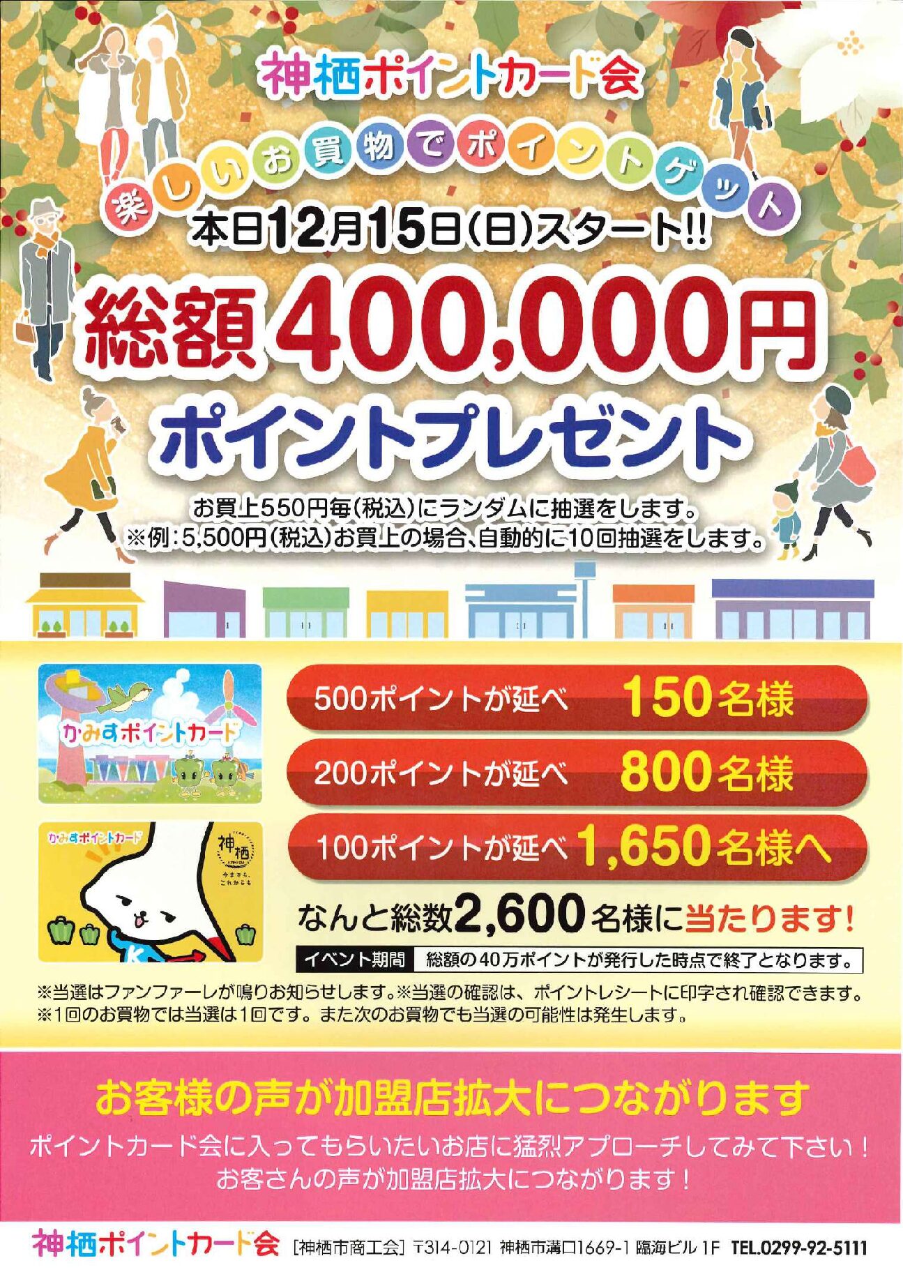 楽しいお買物で総額400,000円分のポイントプレゼント 2024.12.122024.12.12NEWS HOME ブログ NEWS 楽しいお買物で総額400,000円分のポイントプレゼント 12月15日(日)から発行終了まで 楽しいお買い物で総額400,000円分のポイントをどなたでも抽選でプレゼント!! 500ポイントが延べ150名様 200ポイントが延べ800名様 100ポイントが延べ1,650名様 に当たります!! ※当選した際は、ファンファーレでお知らせします。 ※抽選結果はレシートにて確認が可能です。 イベント期間:総額40万ポイントが発行した時点で終了となります。 ご注意:1回のお買い物で当選は1回です。また次のお買い物で当選の可能性は発生します。 以下にポスターと共にご利用可能店舗等の情報をご案内いたしますので、ぜひご確認いただき、周知にもご協力いただければ幸いです! Post Share Hatena Line RSS feedly Pin it note 投稿者: 神栖ポイントカード会事務局 NEWS コメント: 0 かみすフェスタ2024出店!! 楽しいお買物で総額400,000円分のポイントプレゼント コメント ( 0 ) トラックバックは利用できません。 この記事へのコメントはありません。 返信をキャンセルする。 名前 E-MAIL ※ 公開されません URL Δ 関連記事一覧 カードご利用案内・加盟店入会方法をアップしました 2021.10.24NEWS 神栖ポイントカード会ホームページをリニューアルしました! 2021.09.17NEWS 楽しいお買い物で総額500,000円分のポイントプレゼント 2023.09.13NEWS 楽しいお買物で総額400,000円分のポイントプレゼント 2025.09.12NEWS
