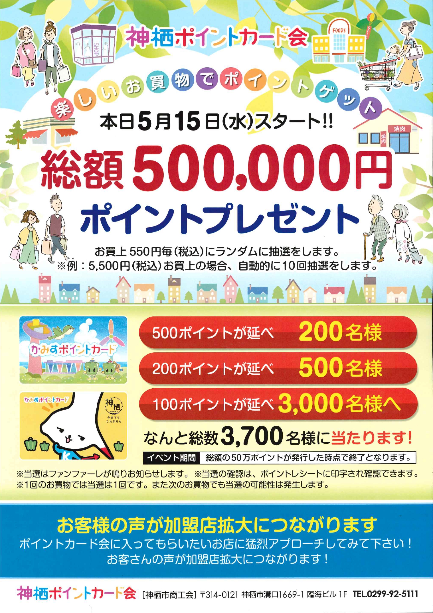 楽しいお買物で総額500,000円分のポイントプレゼント 2024.04.302024.10.02NEWS HOME ブログ NEWS 楽しいお買物で総額500,000円分のポイントプレゼント 5月15日(水)から発行終了まで 楽しいお買い物で総額500,000円分のポイントをどなたでも抽選でプレゼント!! 500ポイントが延べ200名様 200ポイントが延べ500名様 100ポイントが延べ3,000名様 に当たります!! ※当選した際は、ファンファーレでお知らせします。 ※抽選結果はレシートにて確認が可能です。 イベント期間:総額50万ポイントが発行した時点で終了となります。 ご注意:1回のお買い物で当選は1回です。また次のお買い物で当選の可能性は発生します。 以下にポスターと共にご利用可能店舗等の情報をご案内いたしますので、ぜひご確認いただき、周知にもご協力いただければ幸いです! 加盟店掲示ポスター ※チラシ画像をクリック(タップ)で拡大します。 “lower-h2″>ご利用案内(リンク案内) かみすポイントカード会加盟店のご紹介 加盟店のご紹介 「かみすプレミアム付クーポン券」利用店舗案内 『かみすプレミアム付クーポン券』取扱加盟店一覧(神栖市商工会) Post Share Hatena Line RSS feedly Pin it note 投稿者: 神栖ポイントカード会事務局 NEWS コメント: 0 楽しいお買物で総額500,000円分のポイントプレゼント 楽しいお買物で総額400,000円分のポイントプレゼント コメント ( 0 ) トラックバックは利用できません。 この記事へのコメントはありません。 返信をキャンセルする。 名前 E-MAIL ※ 公開されません URL Δ 関連記事一覧 楽しいお買い物で総額500,000円分のポイントプレゼント 2023.09.13NEWS 楽しいお買物で総額400,000円分のポイントプレゼント 2024.12.12NEWS 「ご当地ペイ」にて、神栖ポイントカード会を紹介していただきま... 2025.07.23NEWS 楽しいお買い物で総額550,000円分のポイントプレゼント!... 2023.05.15NEWS